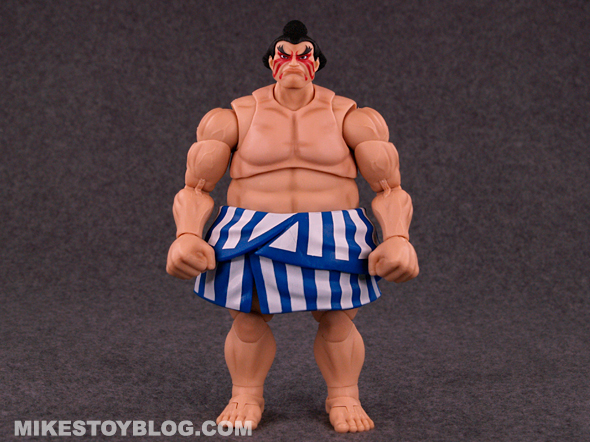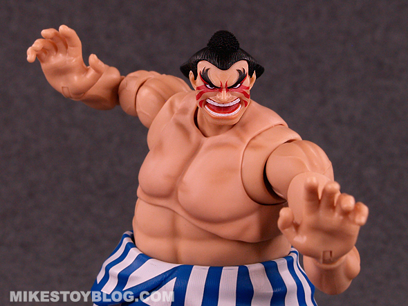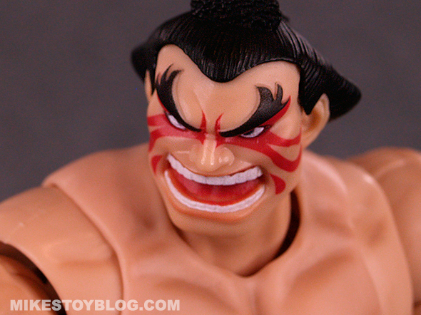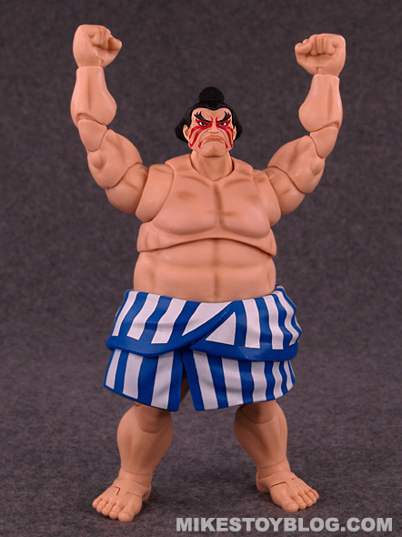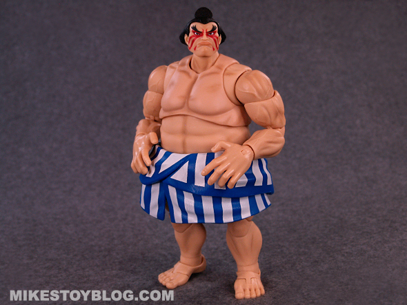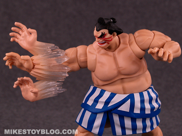 E. Honda comes with the following accessories: Hundred Hand Slap effect piece, a pair of open palm hands and an alternate head sculpt. The Hundred Hand Slap effect piece is great! It’s done really well. The extra “angry” head sculpt is excellent. The extra hands are a nice addition and helps vary the poses you can do. I do wish we got maybe one more pair of hands to use, though.