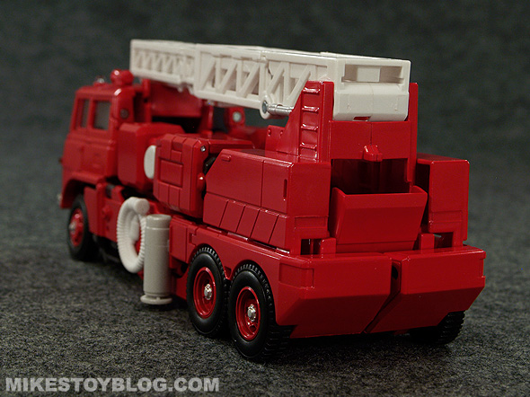 Inferno has a lot of thoughtful articulation, some of it because of the transformation technique and some of it is just designed that way. He has lots of satisfying ratchet joints that make you feel confident that he will hold the pose and not have much trouble with his joints loosening up over time. Even though these Transformers look great in the heroic “museum pose” as seen in some of my photos you can still get very dynamic poses with Inferno if you want and he still looks great doing it and doesn’t look awkward.
